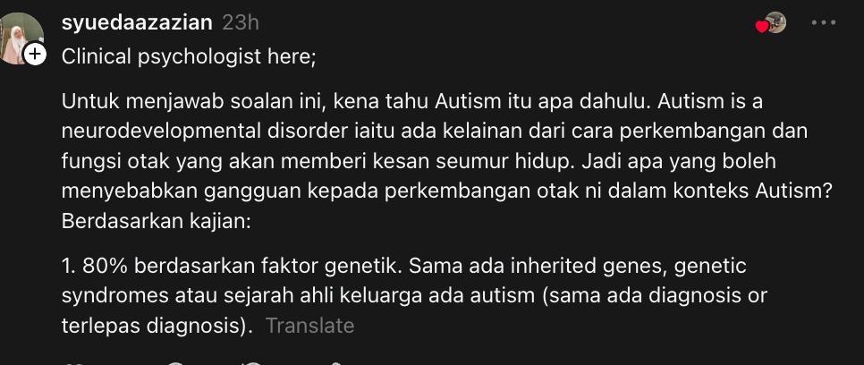 “80% berdasarkan faktor genetik. Sama ada inherited genes, genetic syndromes atau sejarah ahli keluarga ada autism (sama ada diagnosis or terlepas diagnosis).”