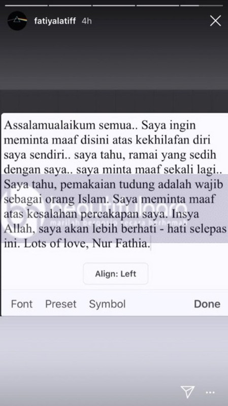 Minggu lalu, hangat dengan kontroversi pelakon Fathia Latiff buka tudung selepas tiga tahun beliau berhijab. Fathia akui tidak menyesal dengan keputusan tersebut dan selesa menjadi diri sendiri.