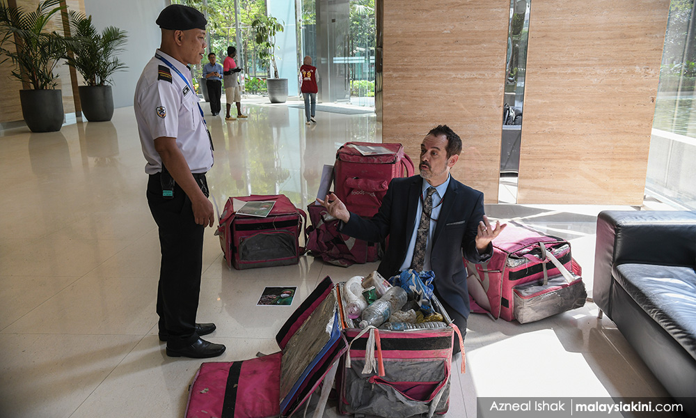 Hickson hadir lengkap bersut dan bertali leher membawa enam beg Foodpanda yang kotor. Apa yang lebih mengejutkan semua, beg ini berisi botol kosong, tin bir kosong, bekas makanan plastik dan barang buangan lain.