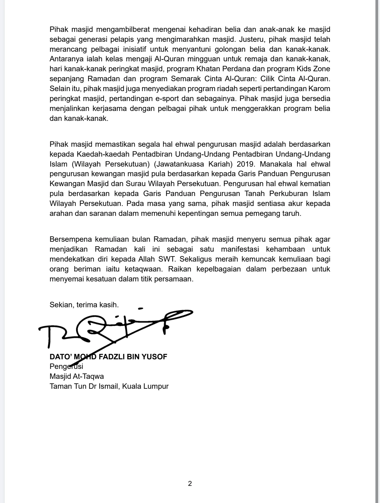 “Pihak masjid mengambil serius mengenai sebahagian komen negatif yang boleh mencemarkan reputasi dan nama baik masjid.”