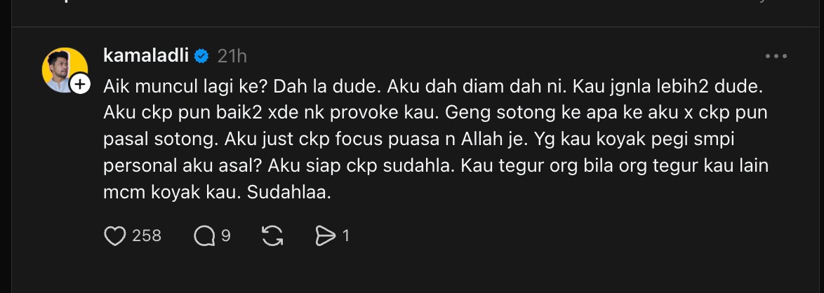 Namun begitu, teguran Kamal tidak diterima baik Tareq Fit malah dihentam kembali ‘influencer fitness’ itu.