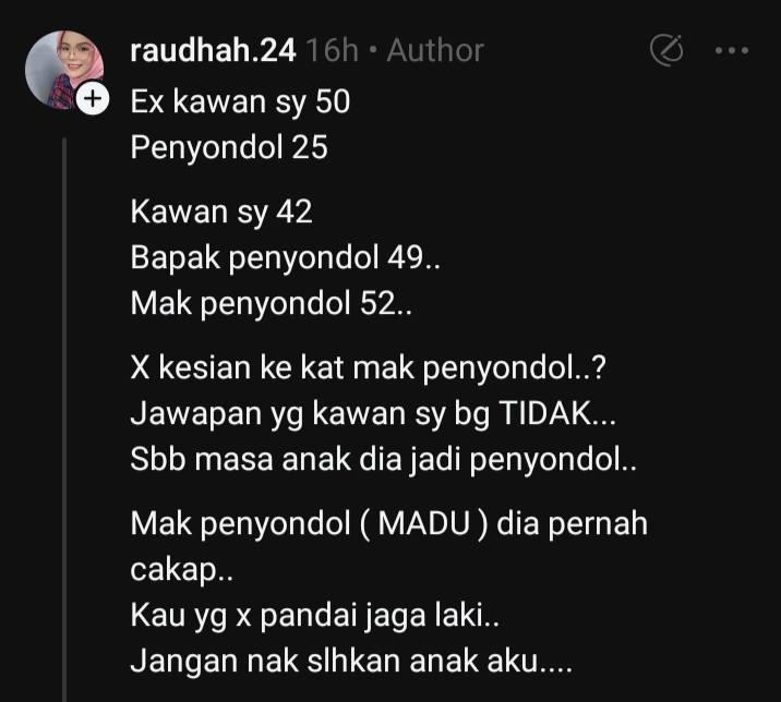 Tapi bekas suami dia dan perempuan tu belum kahwin. Kawan saya cakap, seronok apabila tengok orang yang kita sayang kena sondol. Sekarang kau (penyondol) dan mak kau boleh menangis macam aku dulu. Kau kejam, aku lagi kejam.