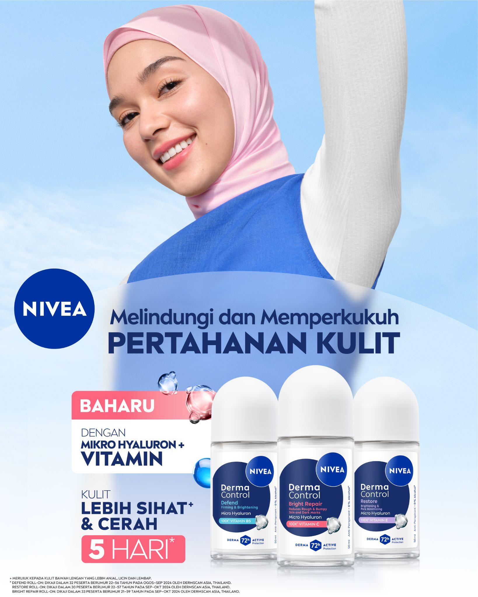 -NIVEA Derma Control Defend: Untuk menguatkan pertahanan kulit dengan Micro Hyaluron + 100x Vitamin B5, membantu menegangkan kulit bawah lengan dalam masa 5 hari.