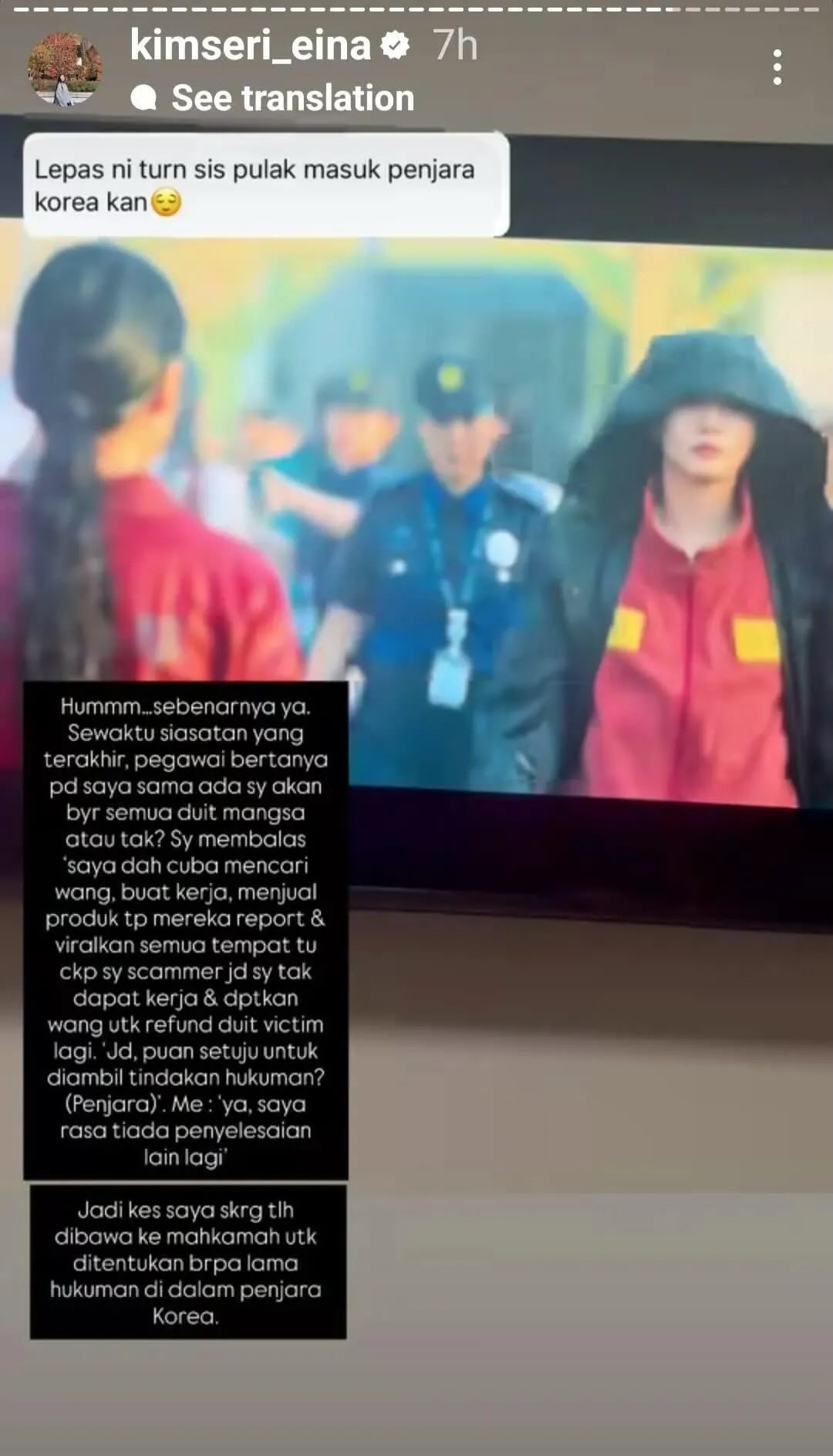 Menerusi hantaran tersebut, wanita dikenali sebagai Nor Seri Azlina mendakwa Kim Seri Aina kini berada “selangkah lagi” untuk berdepan hukuman penjara susulan pengakuan terhadap perbuatan menipu ramai pelanggan.