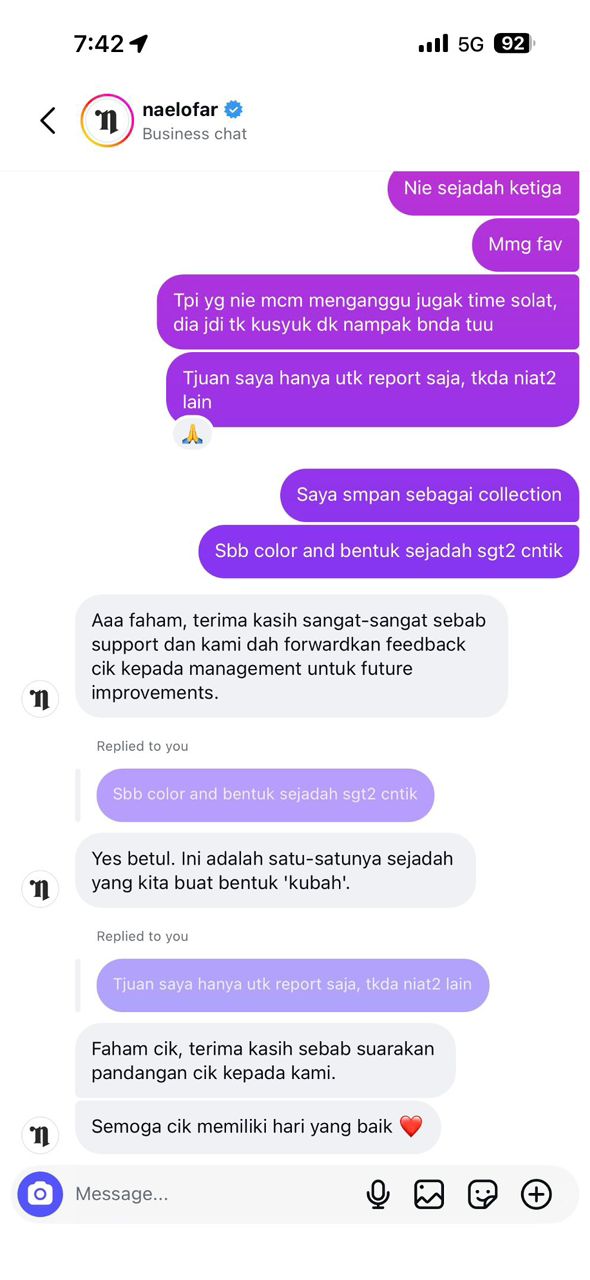 Menerusi satu hantaran di Threads, individu tersebut bertanya kepada pelanggan jenama berkenaan sama ada sejadah yang dibeli turut mempunyai corak yang sama seperti yang ditemuinya.