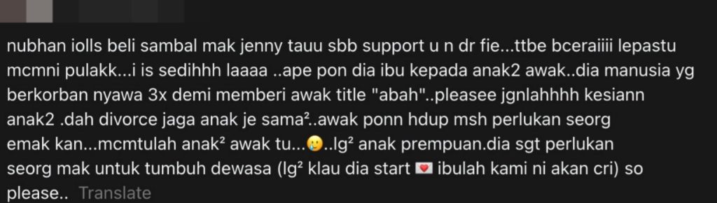Apa pun dia ibu kepada anak-anak awak. Dia manusia yang berkorban nyawa tiga kali demi memberi awak title ‘abah’. Please janganlah… kesian anak-anak. Dah divorce, jaga anak je sama-sama.