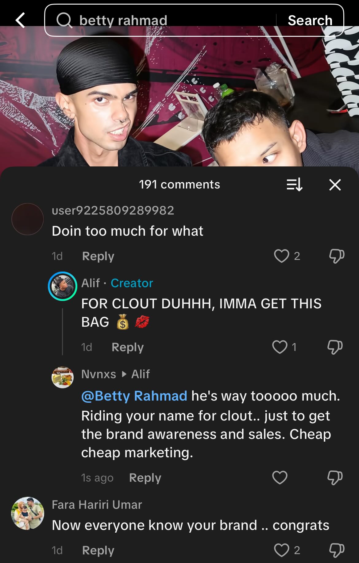 “Dia mengaku yang dia buat adalah untuk ‘clout’. Marketing murahan menggunakan nama awak untuk mendapatkan keuntungan,” kongsinya.