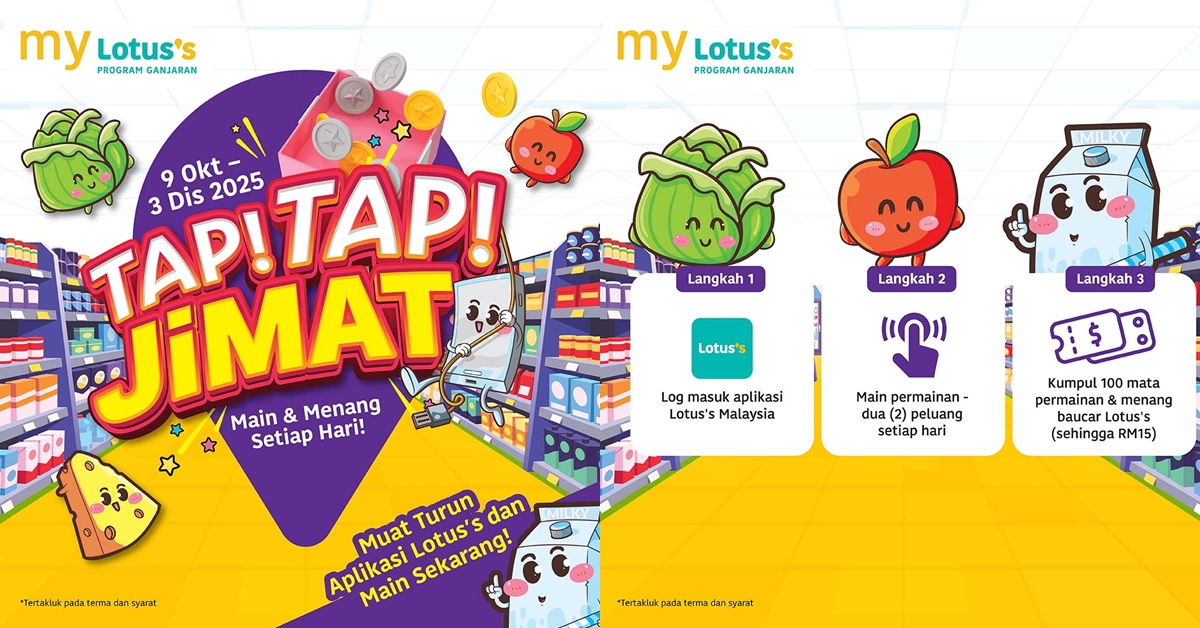 Kalau anda jenis yang suka beli-belah online atau malas nak keluar rumah, Lotus’s Kan Ada untuk tolong anda. anda cuma perlu download aplikasi Lotus’s di Playstore atau App Store, log masuk, dan join peraduan Tap! Tap! JiMAT bermula 9 Oktober hingga 3 Disember 2025.