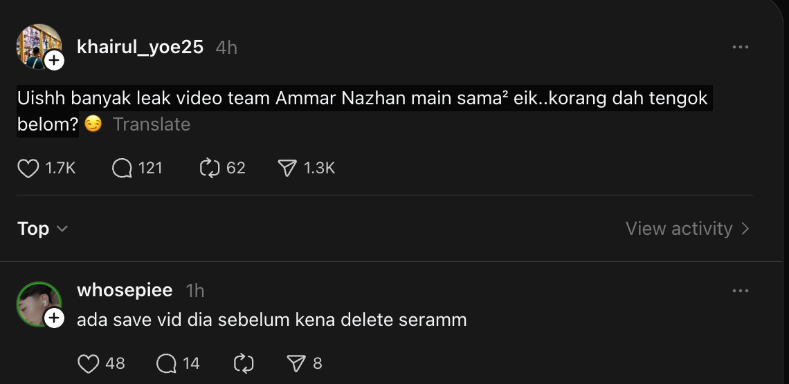 Perkara itu mula diperkatakan selepas beberapa pengguna Threads dan X berkongsi hantaran serta tangkap layar yang mendakwa wujud kandungan bocor (leak). Bagaimanapun, setakat ini tiada pengesahan rasmi dikeluarkan oleh pihak Ammar Nazhan atau wakil pasukannya berhubung kesahihan dakwaan berkenaan.